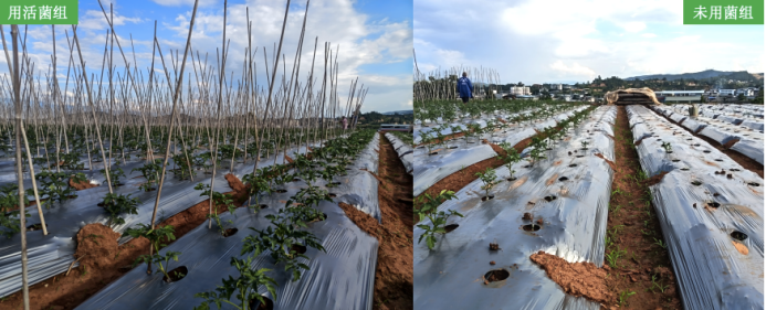 土壤改良:在云南元谋县大番茄基地,活菌发酵技术精准护航,改土菌+抗线菌用两次,2L/亩,随水滴灌,保苗率提高45%,成活率高达95%以上,杜绝死棵烂苗危机。